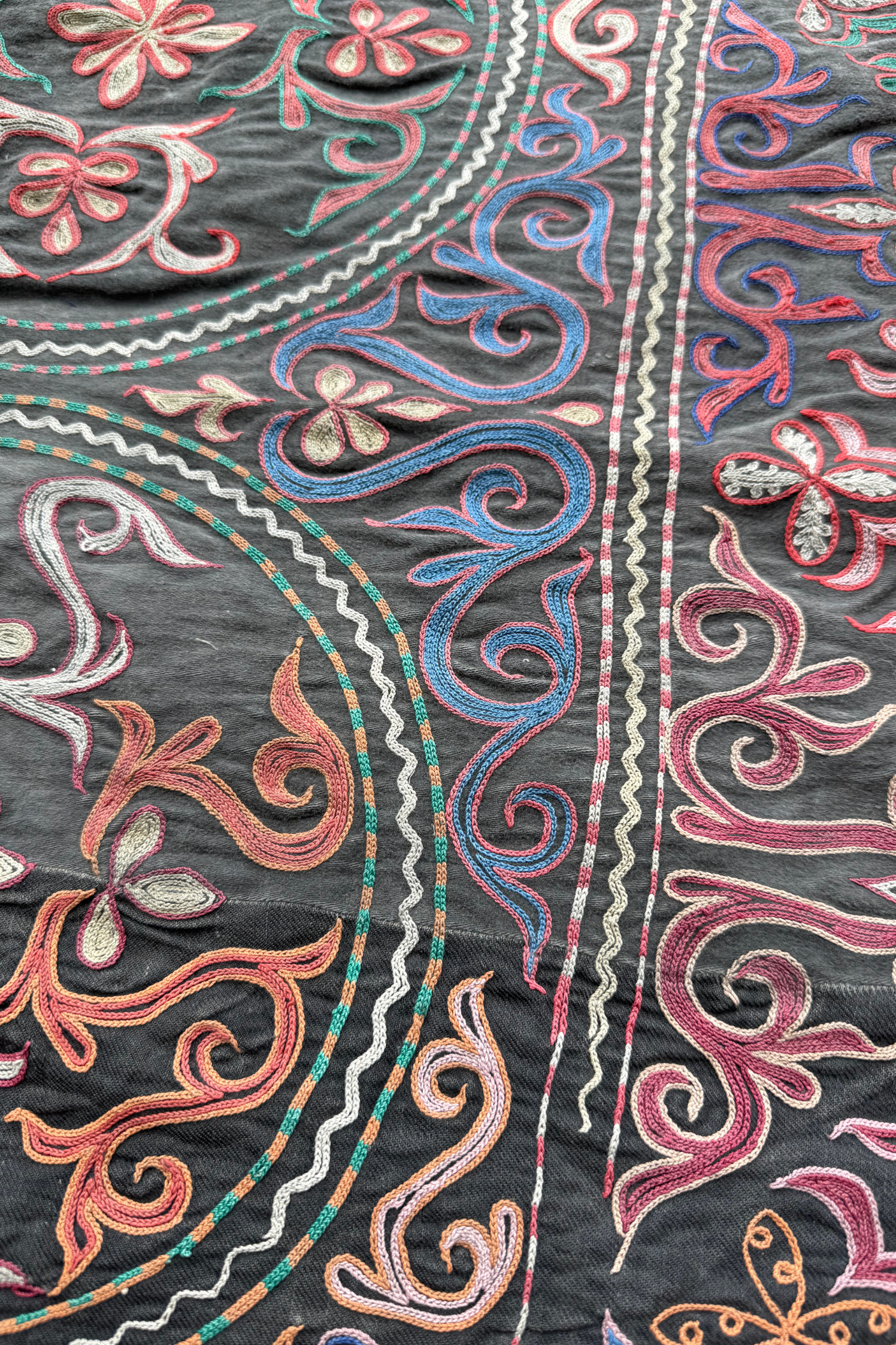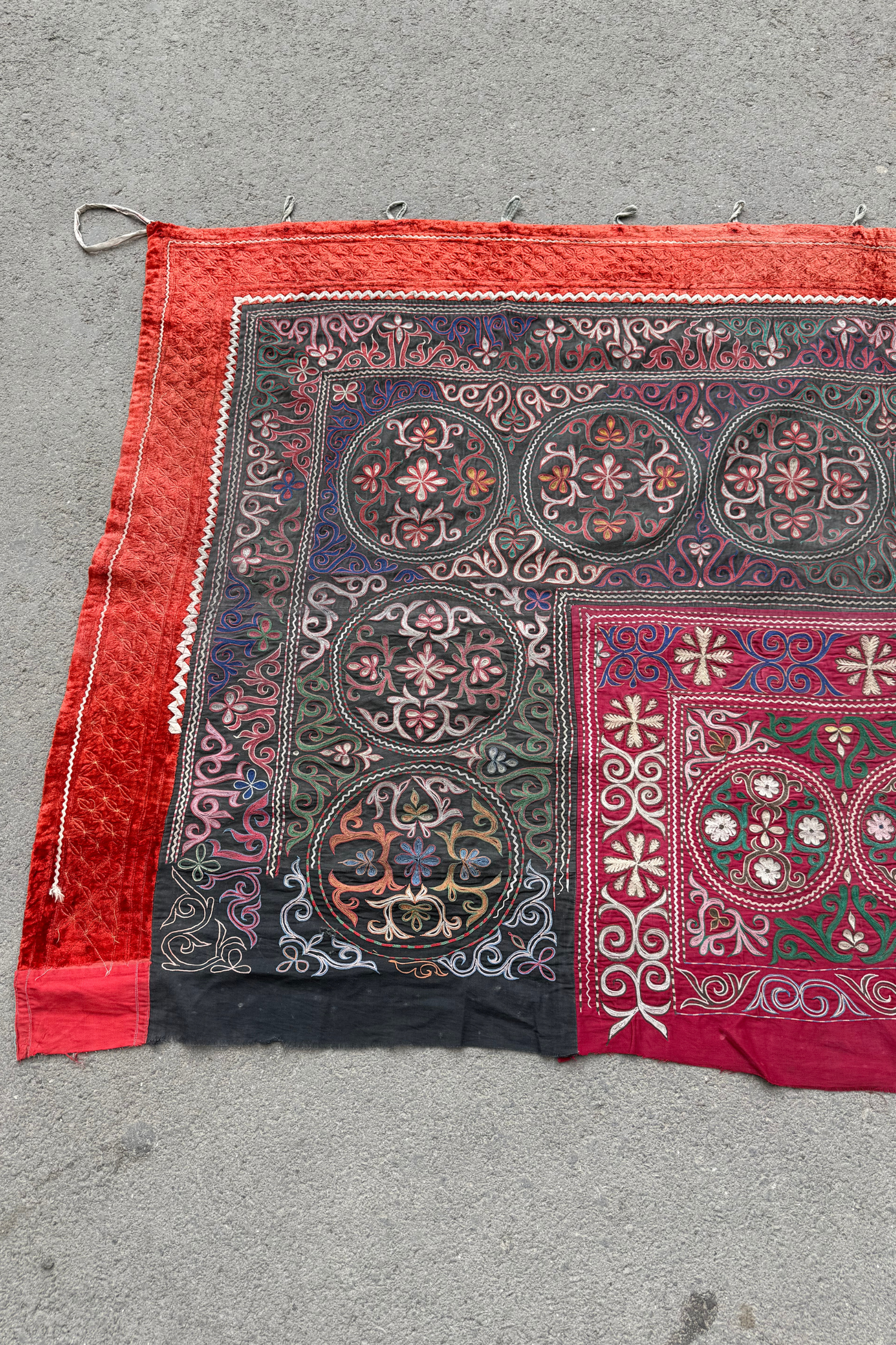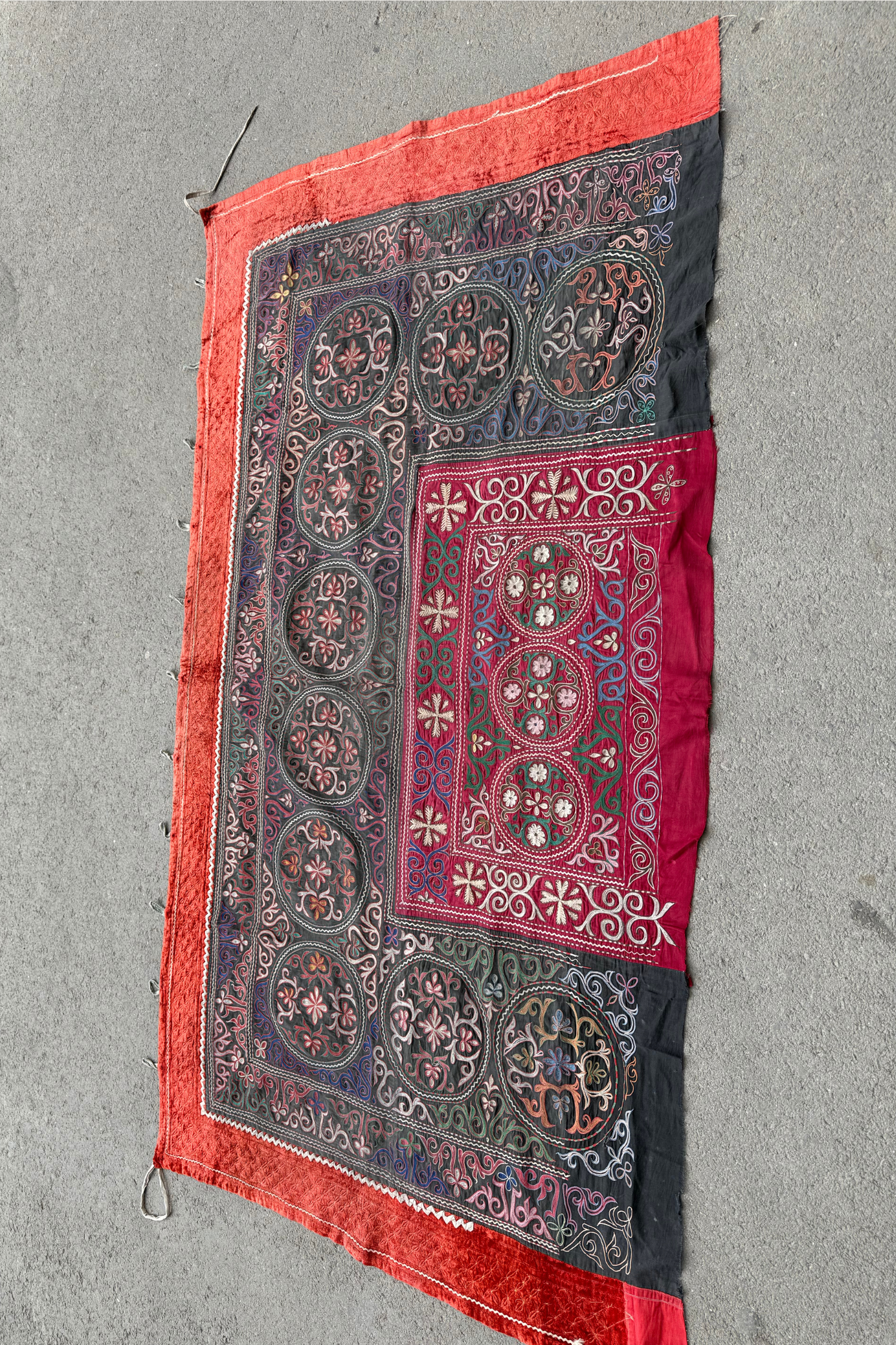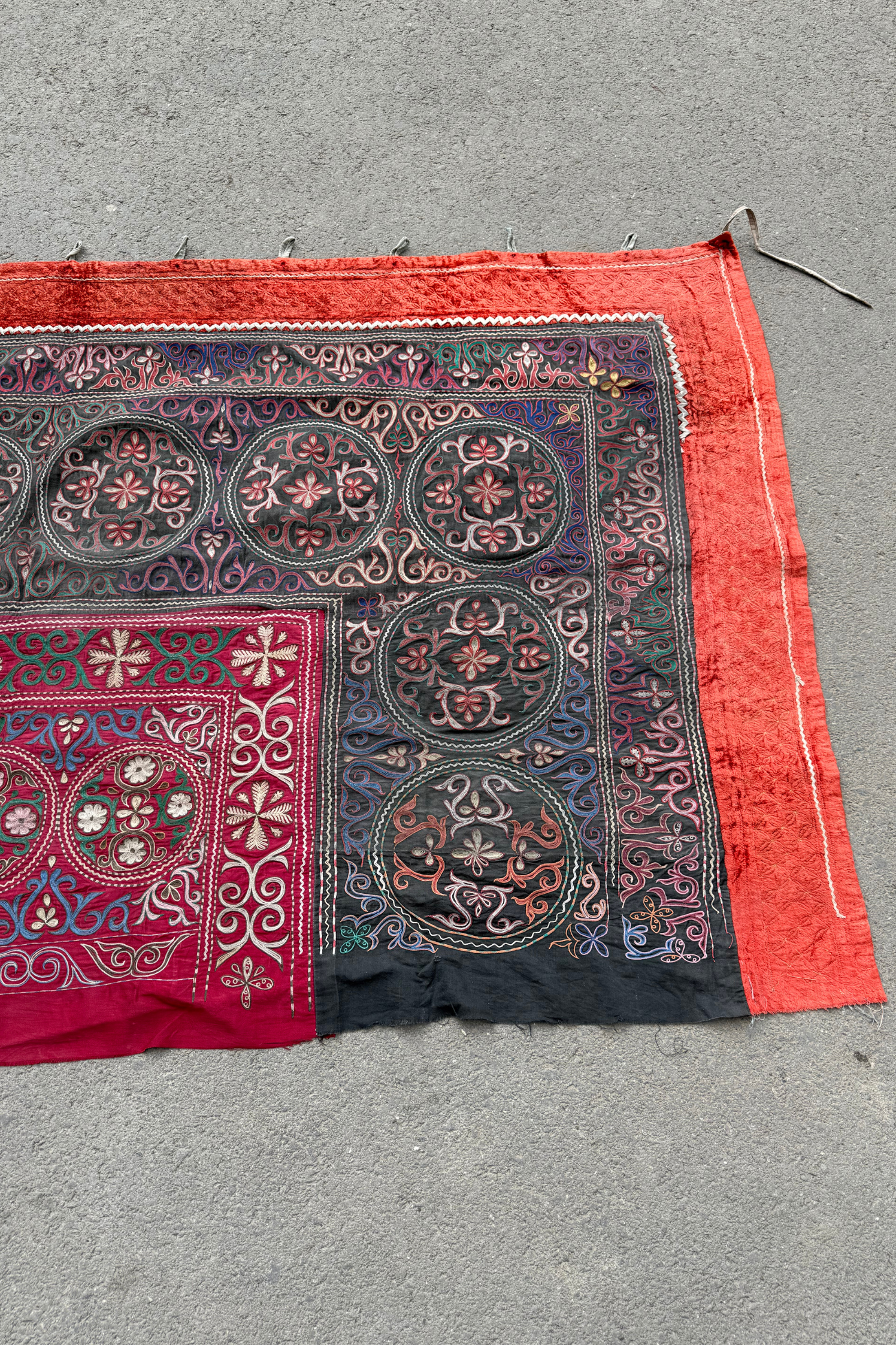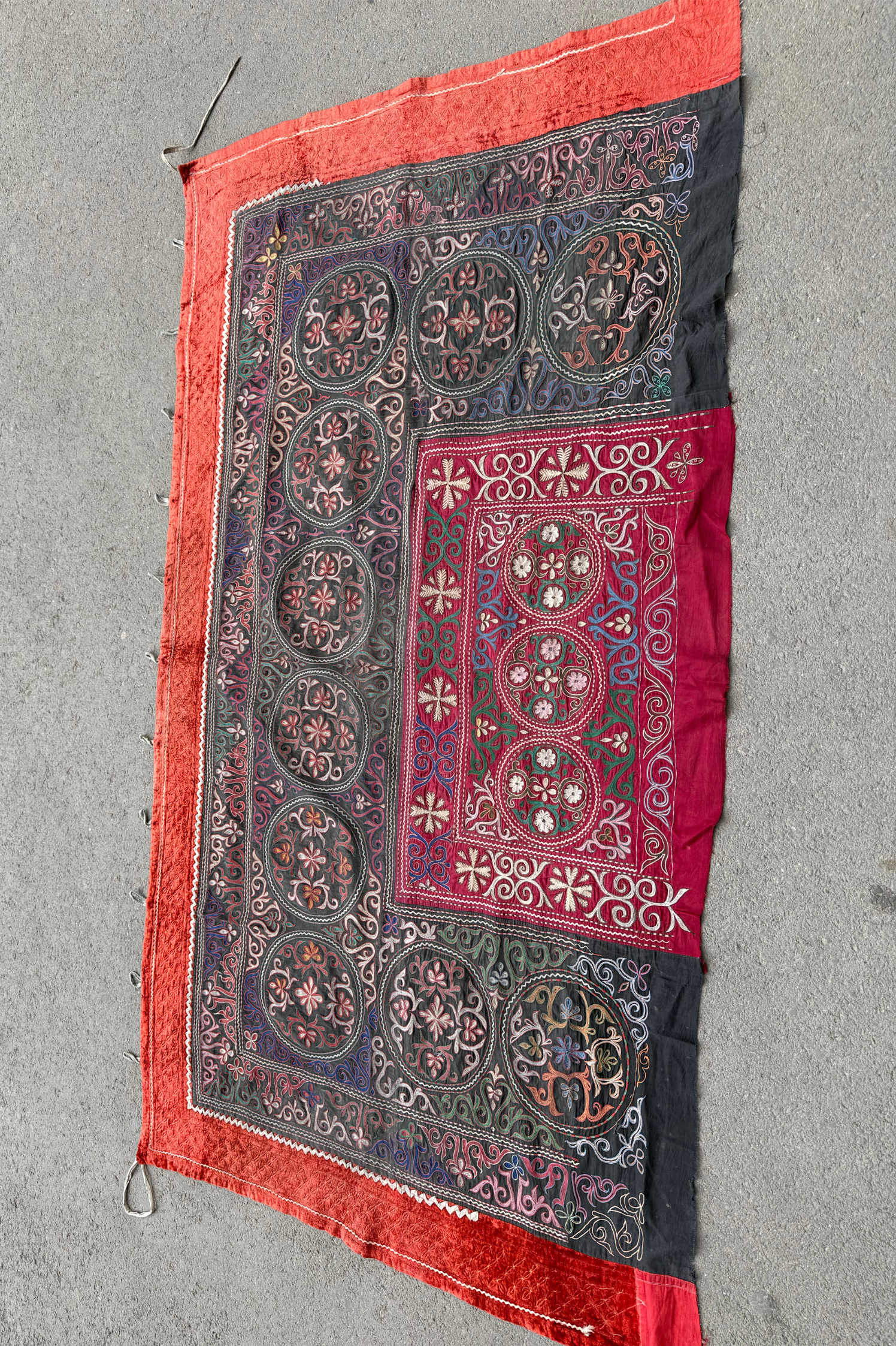 Tus kiiz display stylized patterns inspired by plants and animals, including flowers and ram’s horns (qoshqarmüiiz), as well as designs named after animal organs like liver, kidney, and heart. These patterns are often symmetrical and cover the entire surface. The main embroidered area is bordered by red velvet on three sides. Some believe the fourth side is left unfinished because it hangs behind the bed, while others say a finished fourth side signifies the craftswoman has completed her life’s work.