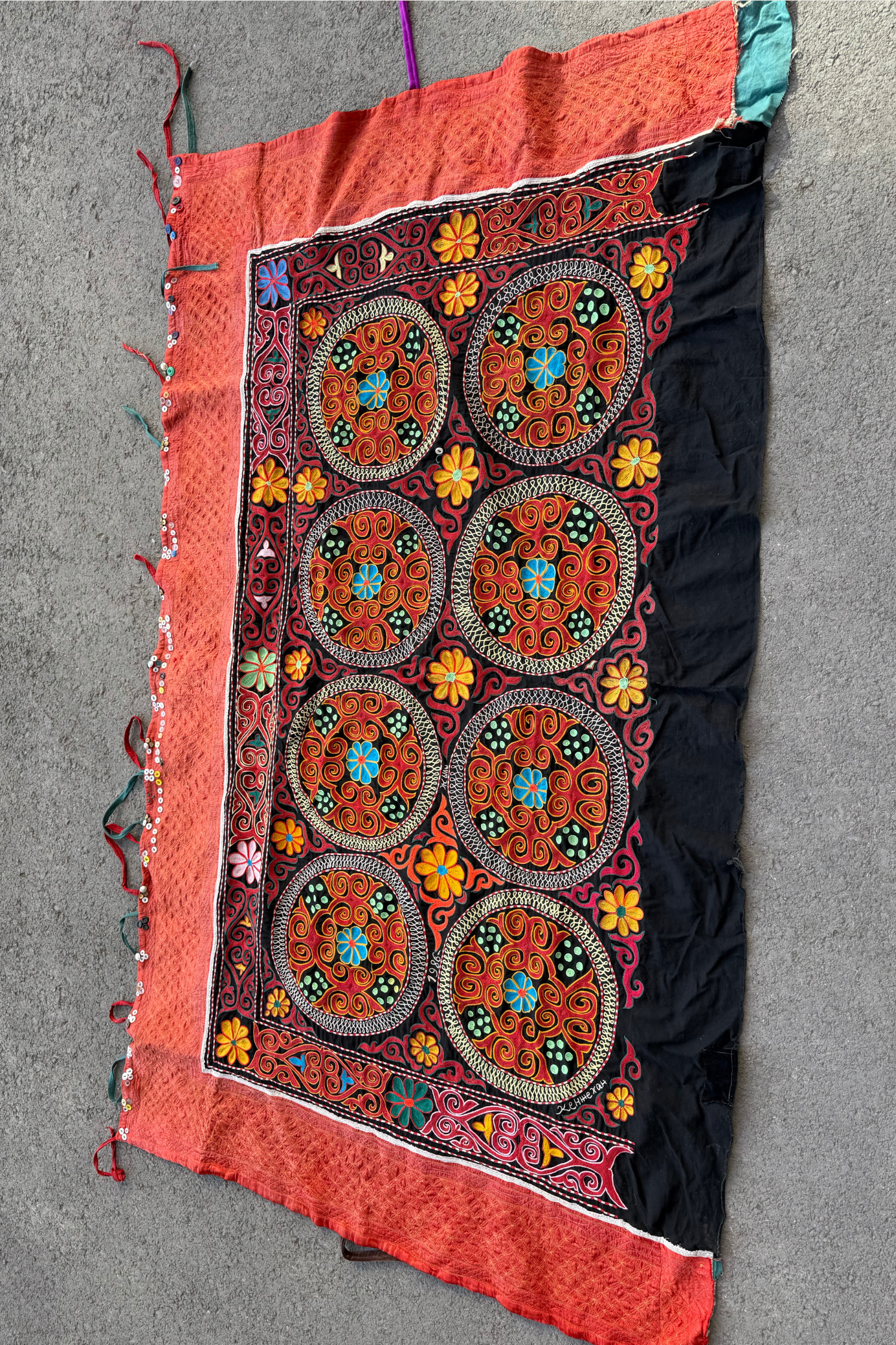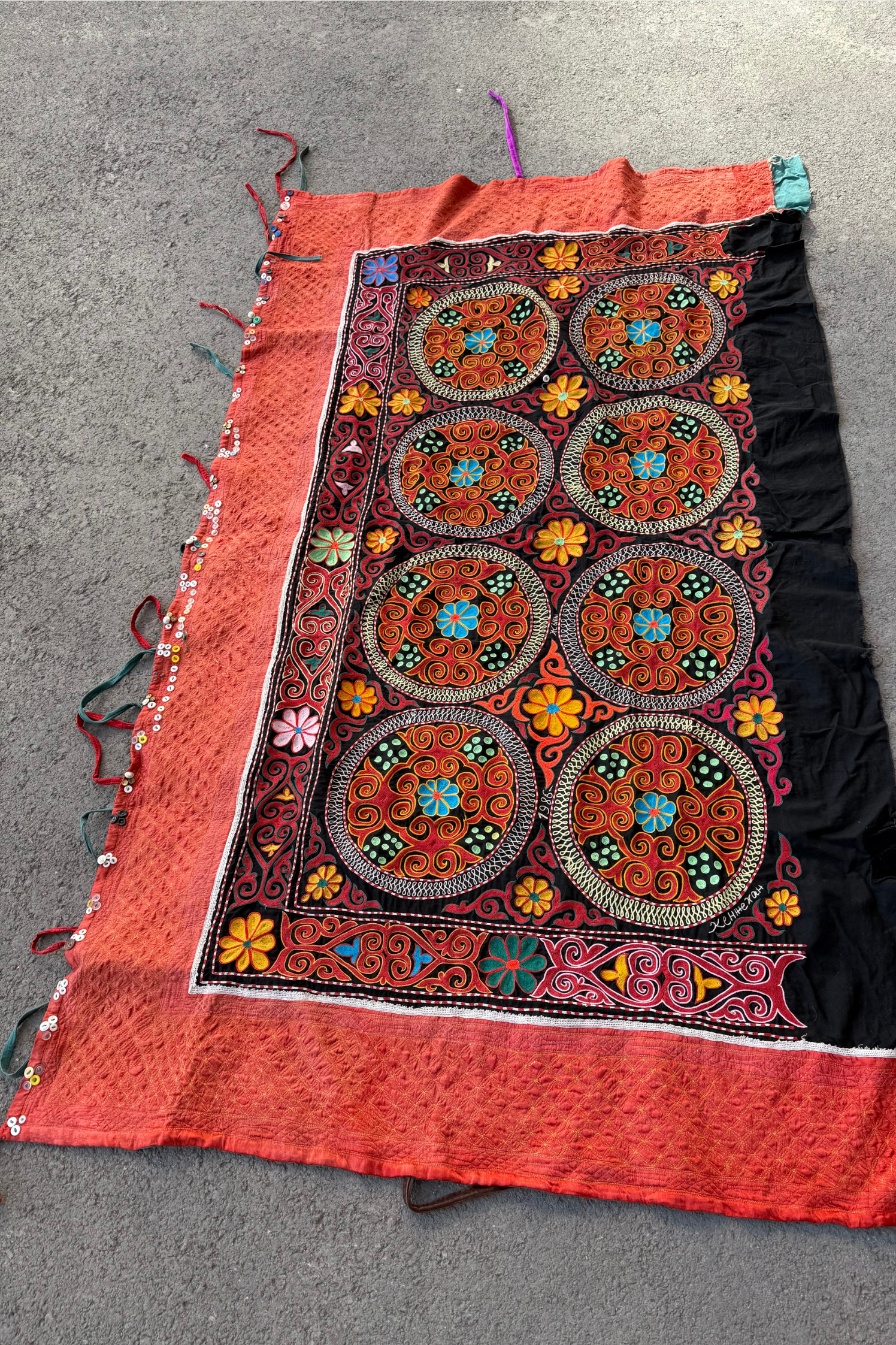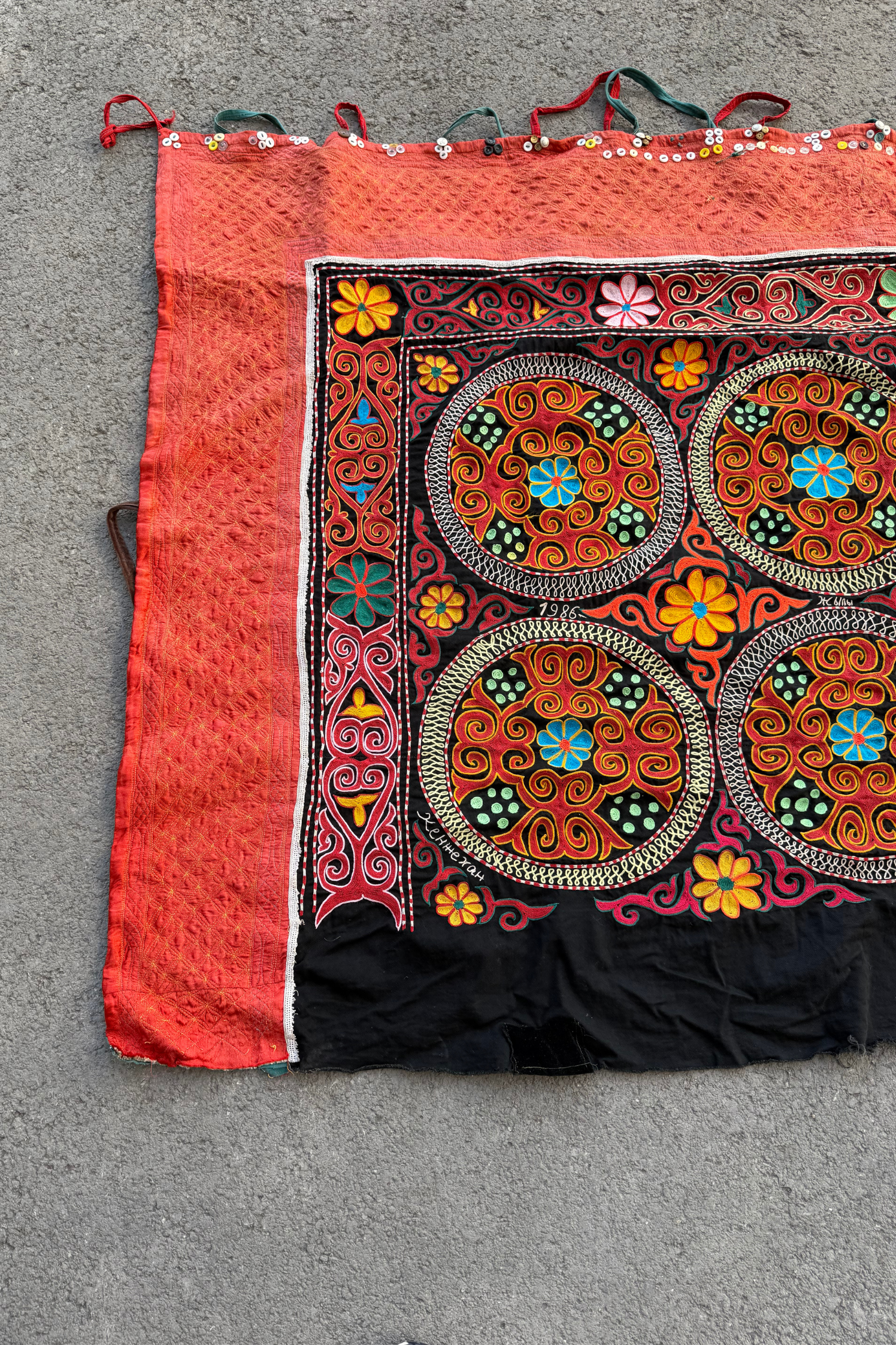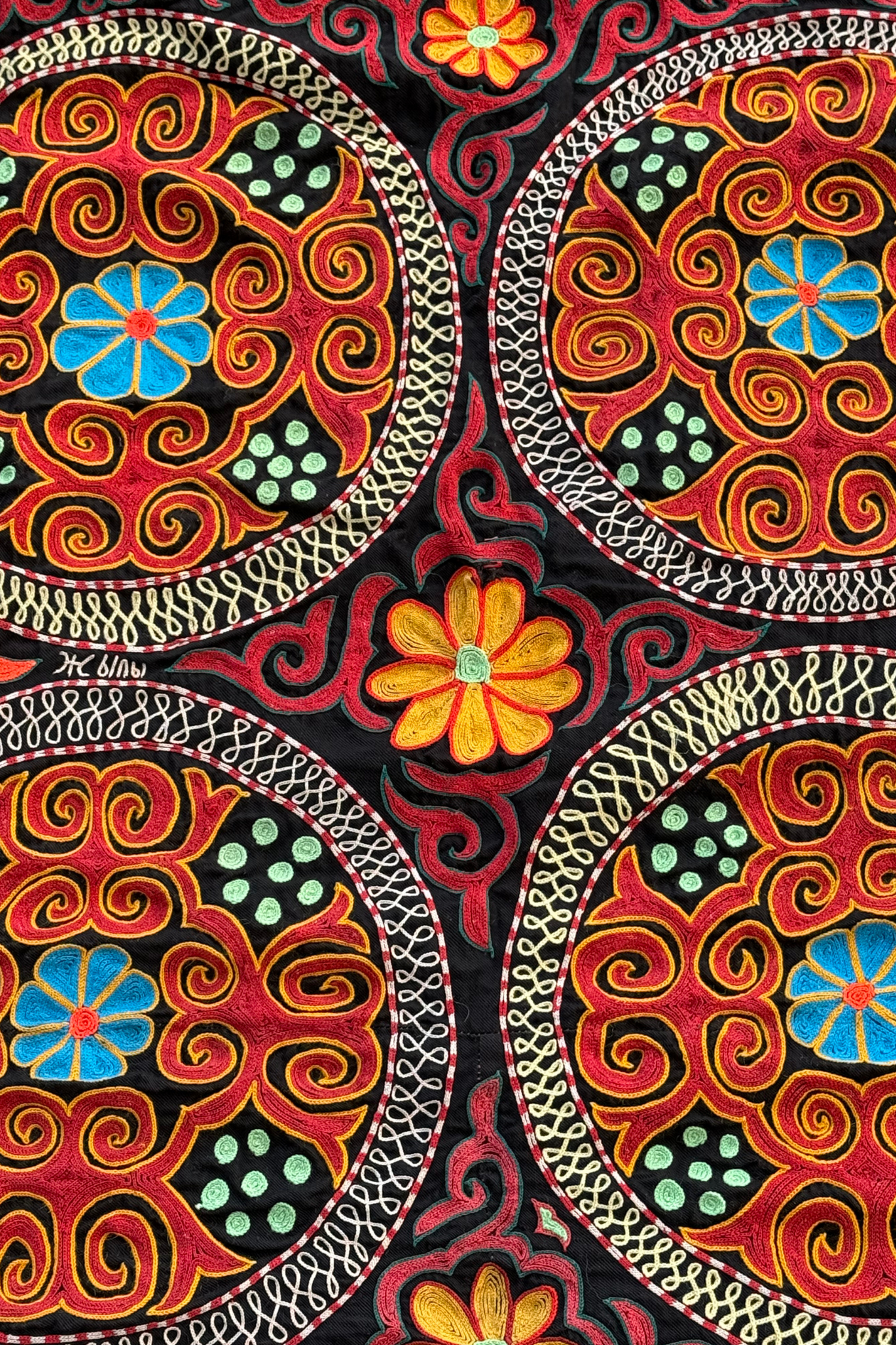Tus kiiz display stylized patterns inspired by plants and animals, including flowers and ram’s horns (qoshqarmüiiz), as well as designs named after animal organs like liver, kidney, and heart. These patterns are often symmetrical and cover the entire surface. The main embroidered area is bordered by red velvet on three sides. Some believe the fourth side is left unfinished because it hangs behind the bed, while others say a finished fourth side signifies the craftswoman has completed her life’s work.