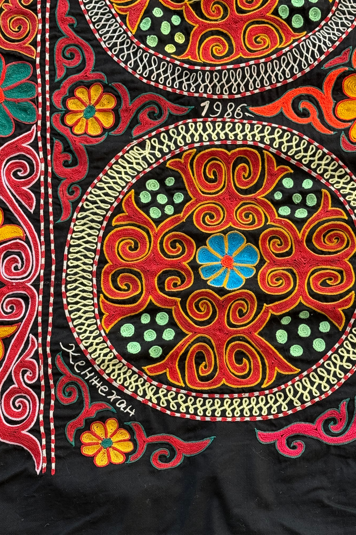 Tüs kiiz is a traditional embroidered wall hanging displayed in summer yurts (kiiz ui) and sometimes winter homes. Handmade by women, these textiles serve as family heirlooms or wedding gifts, often featuring dedications to spouses, the year made, and the craftswoman’s signature. Each family member may have a favorite tus kiiz displayed near their sleeping area.